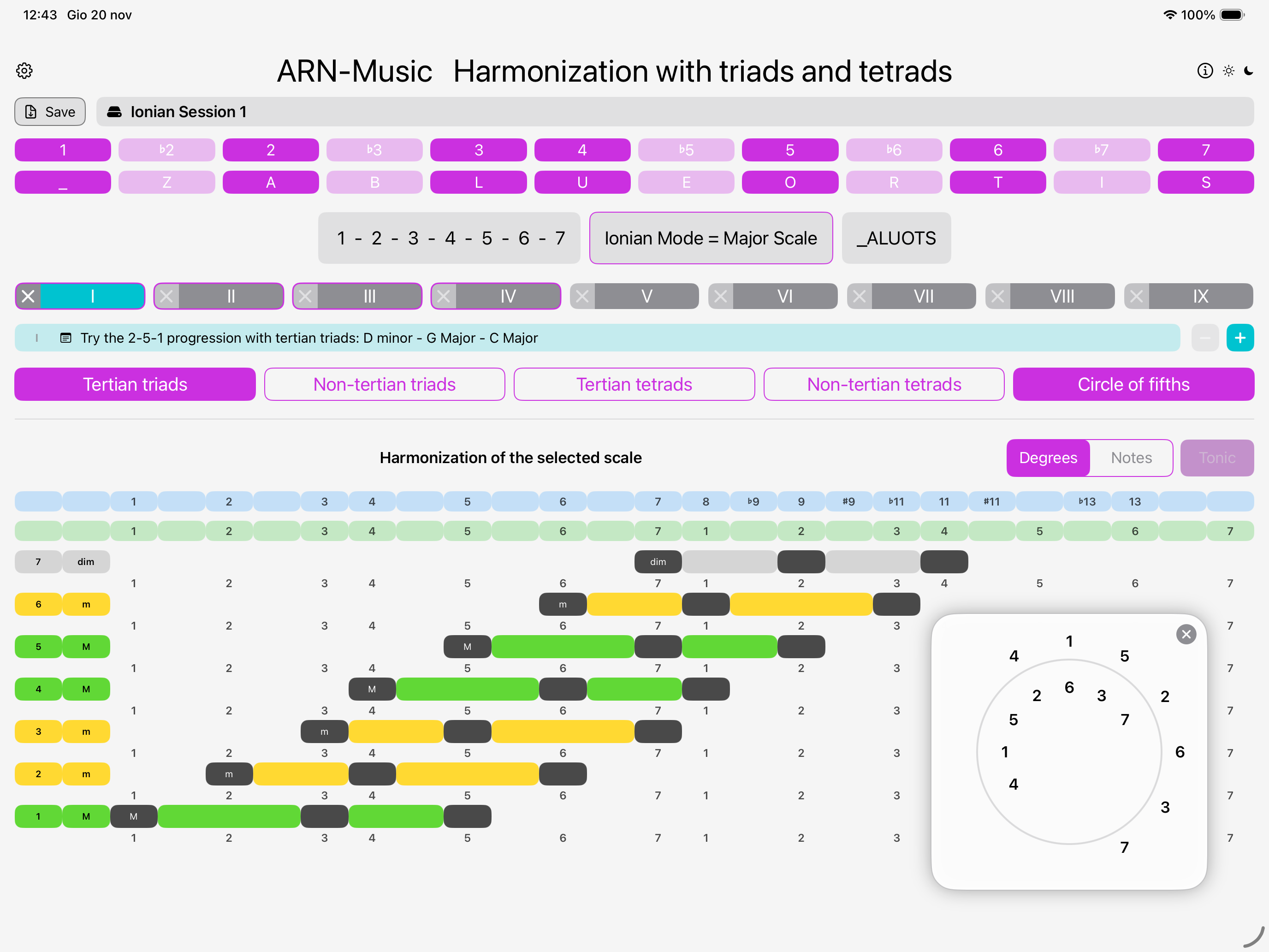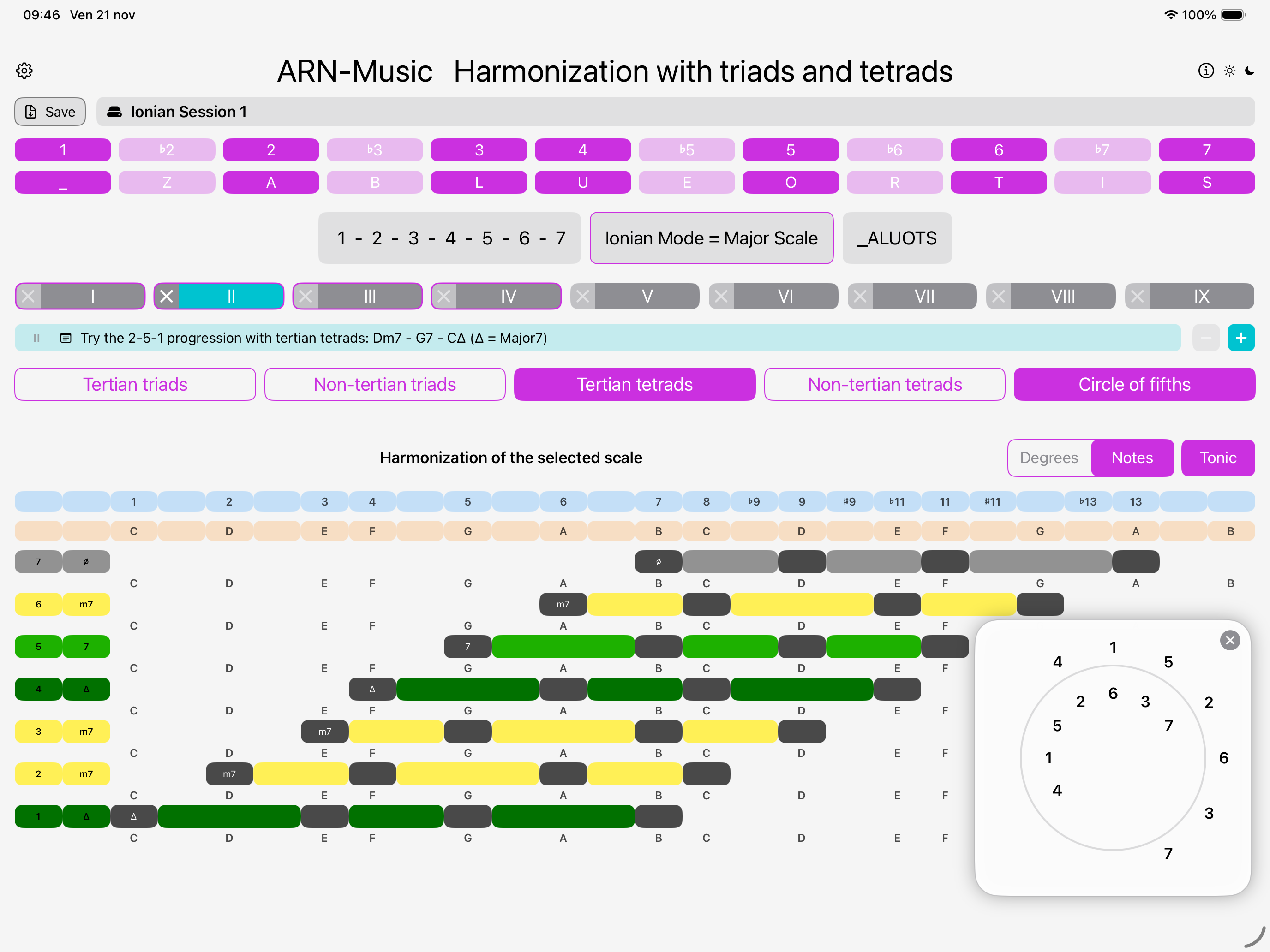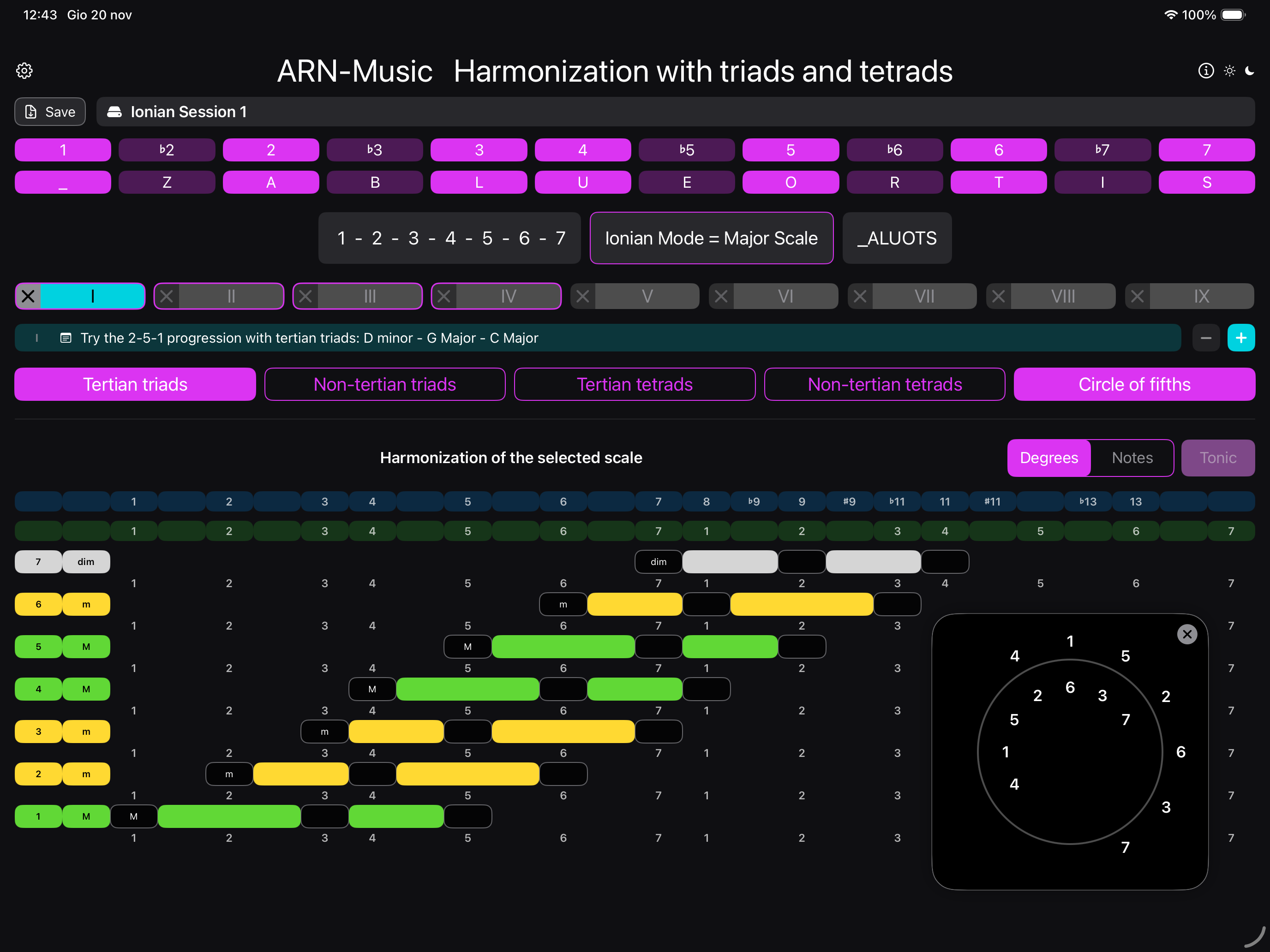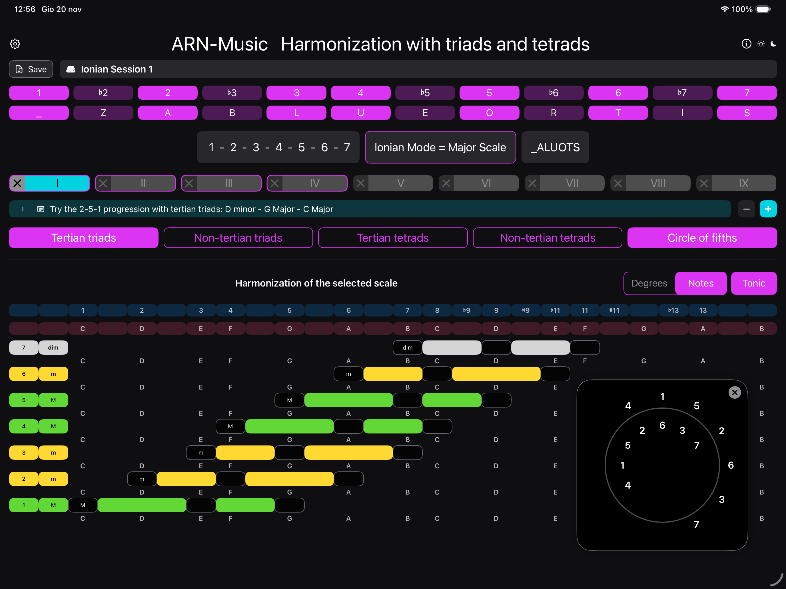 Thanks to the dedicated Circle of fifths for each scale, you can easily create harmonious chord progressions.