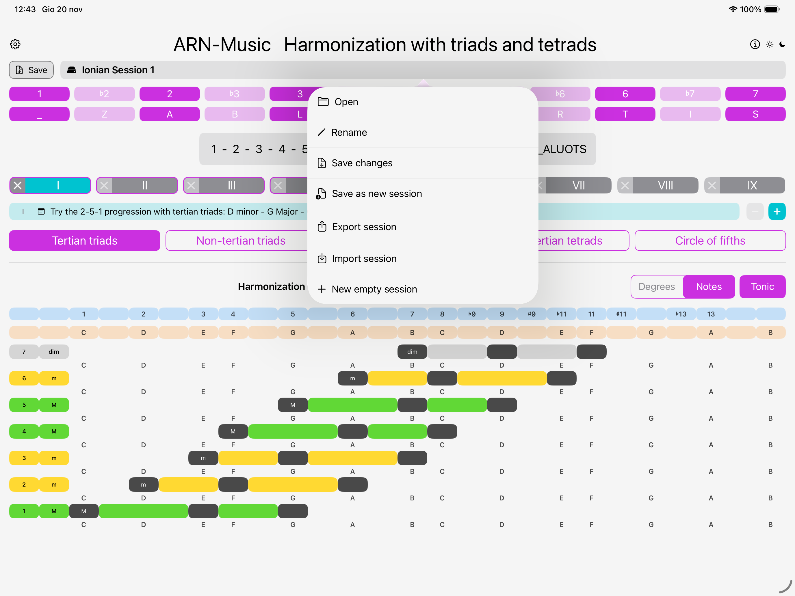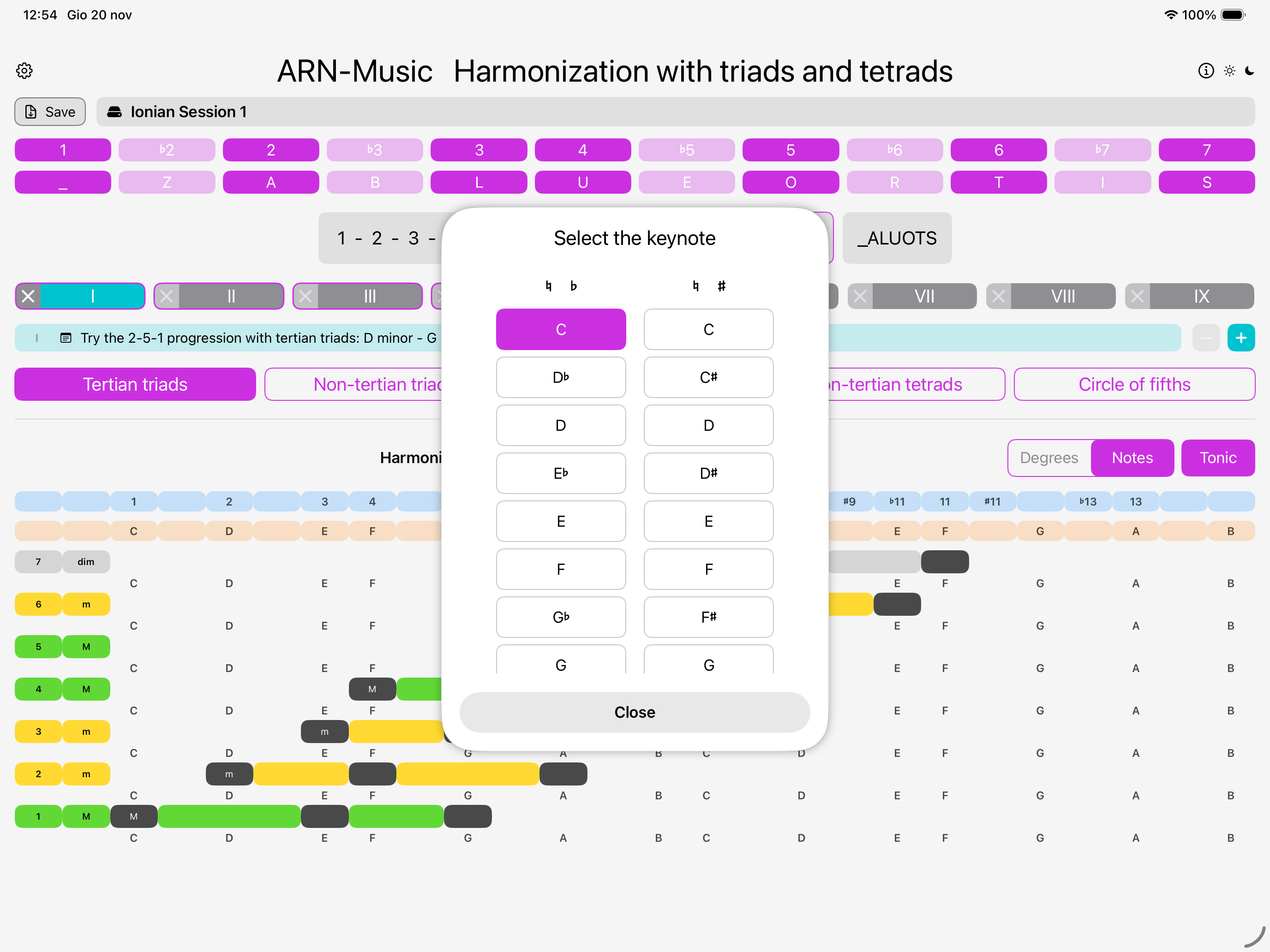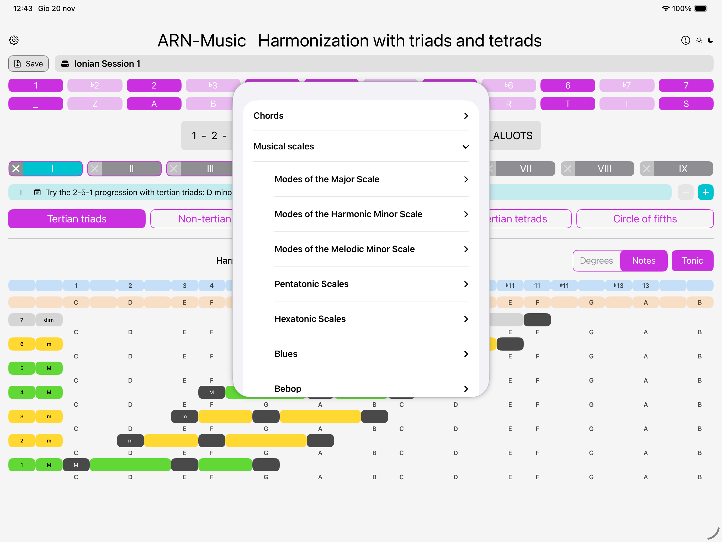 Choose between degrees or notes and select the tonic you want.