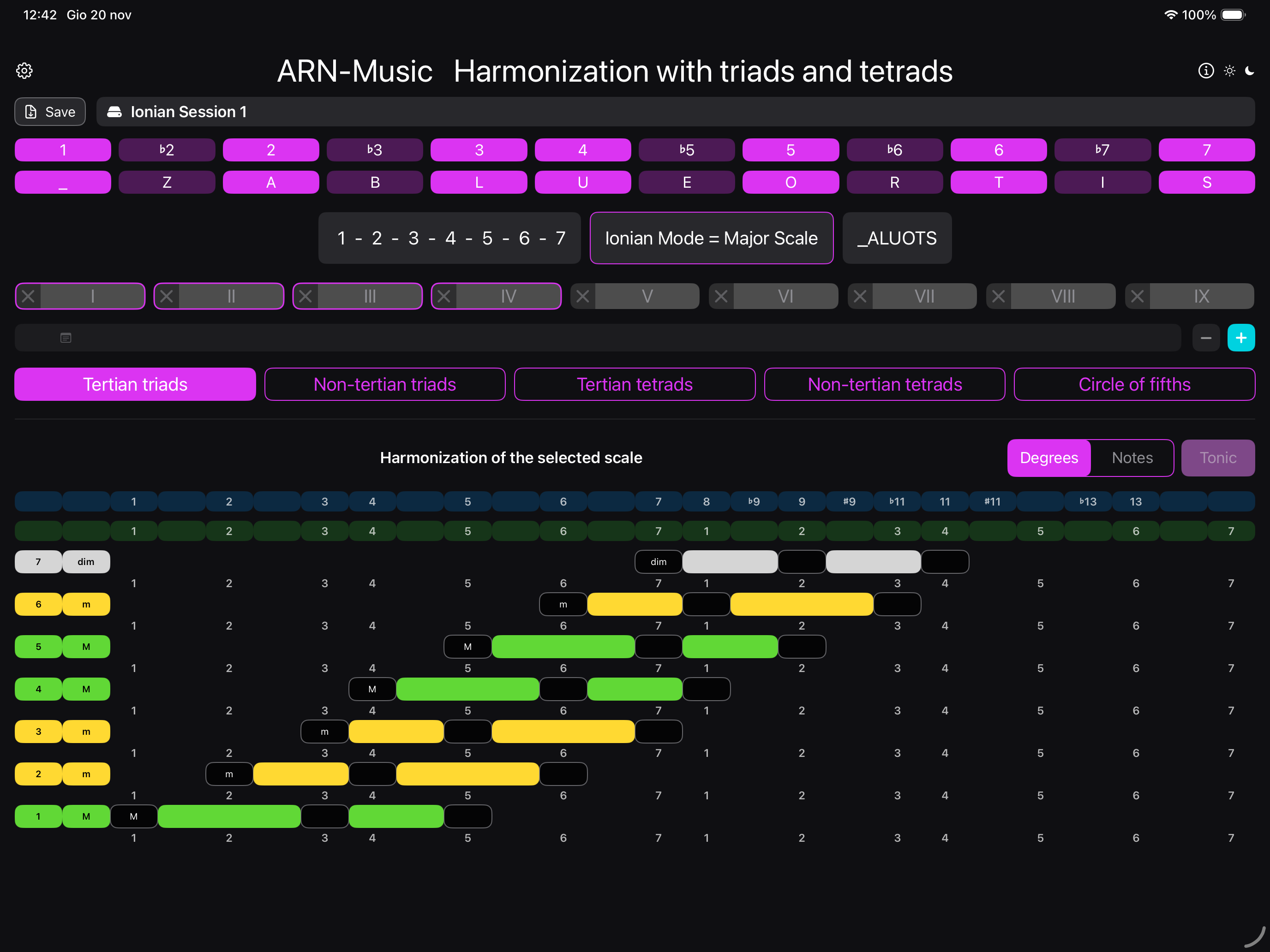 The app innovatively displays the triads and the tetrads of any musical scale.