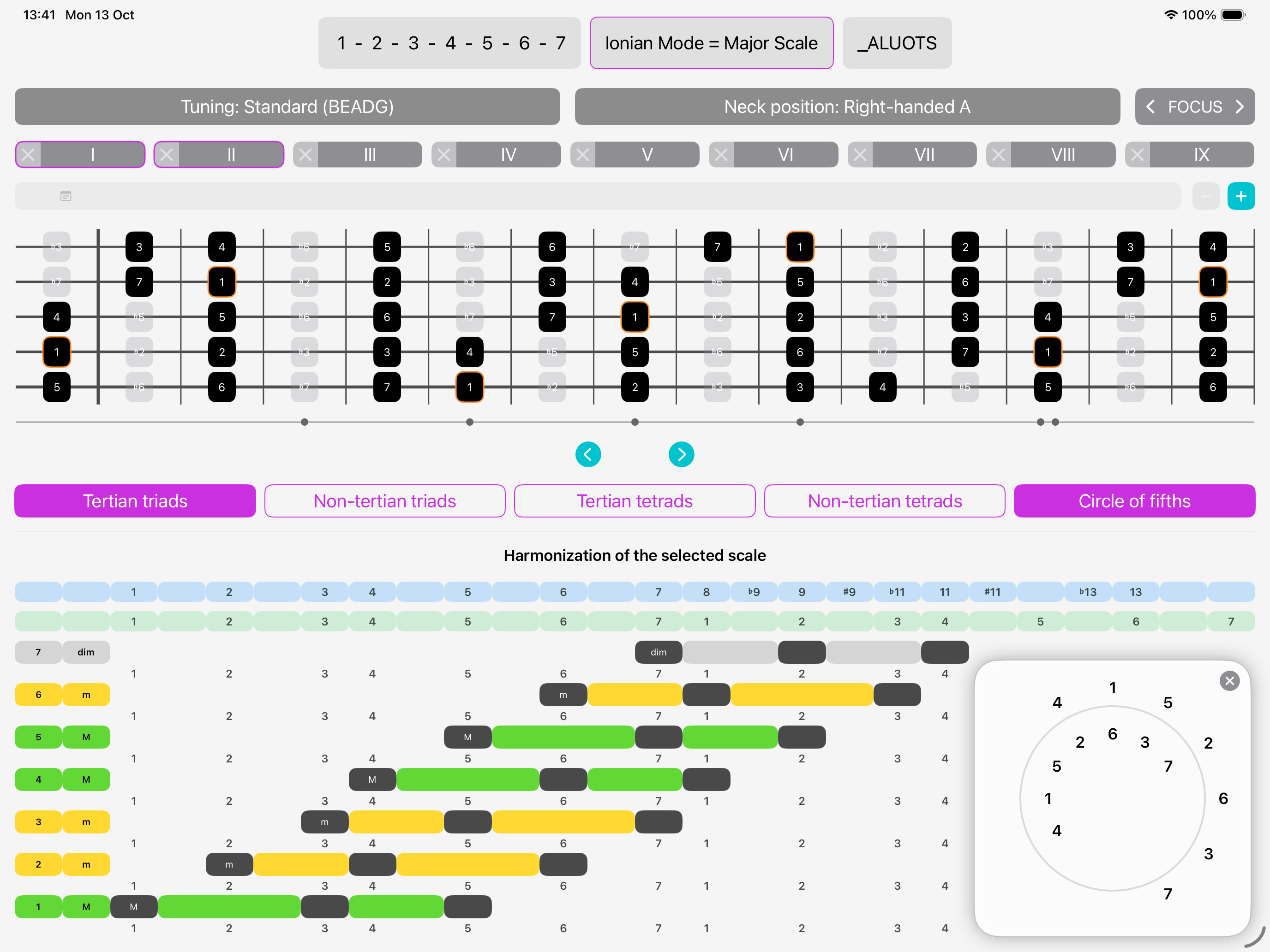 Thanks to the dedicated Circle of fifths for each scale, you can easily create smooth chord progressions.