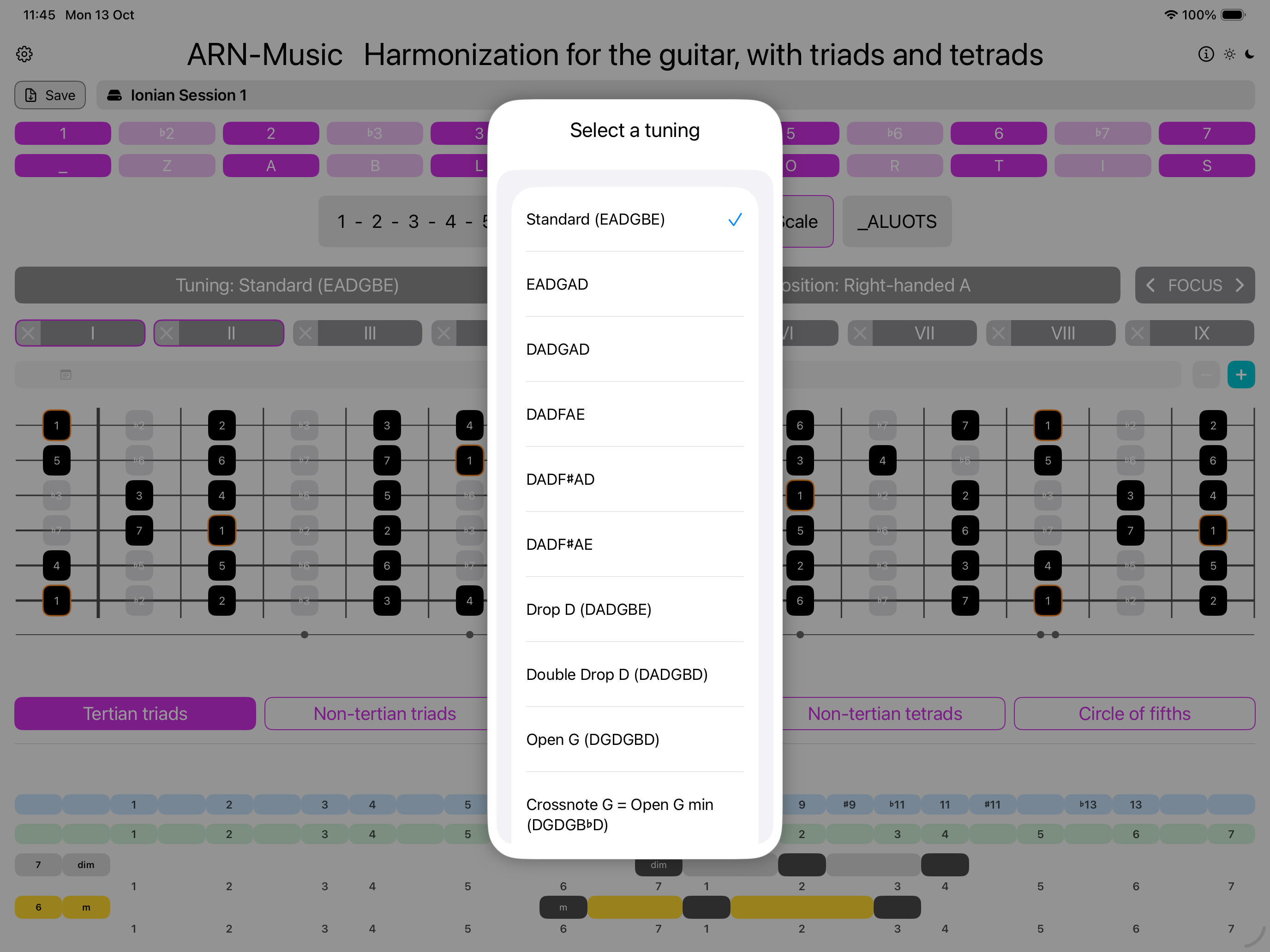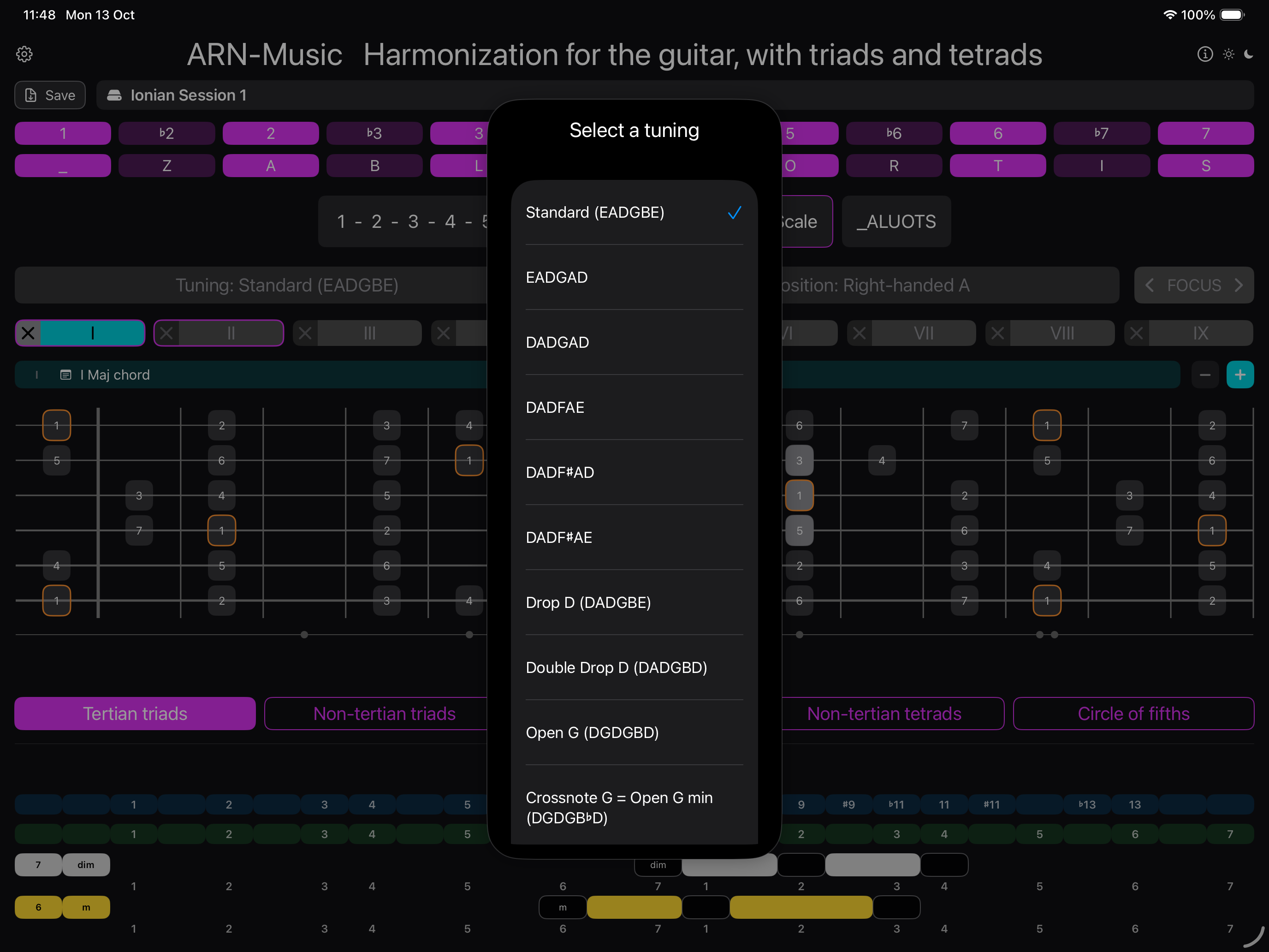 Want to experiment? Try different tunings and instantly get the right scale degrees for over 10 tuning presets for the Guitar, and over 10 tuning presets for the Bass (6 strings).
