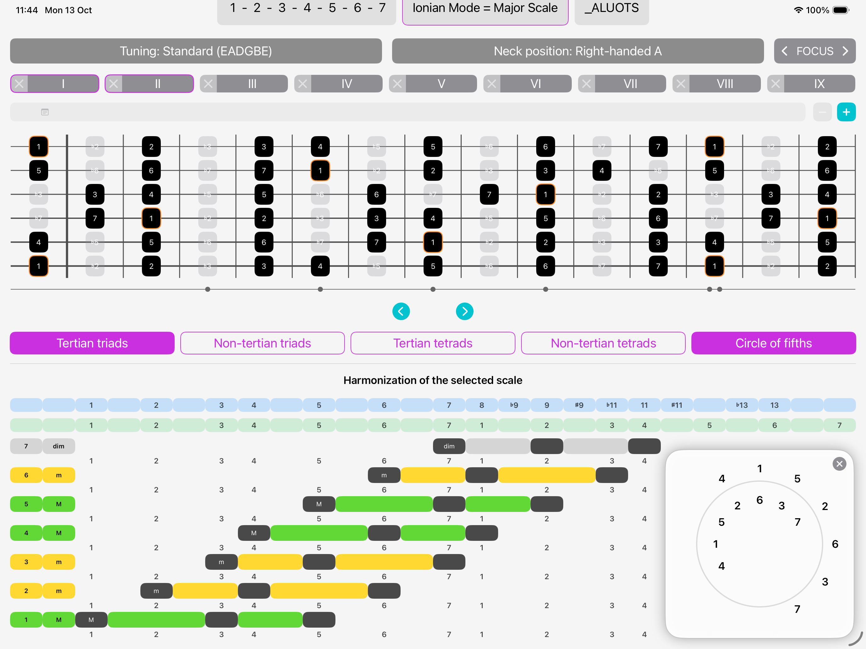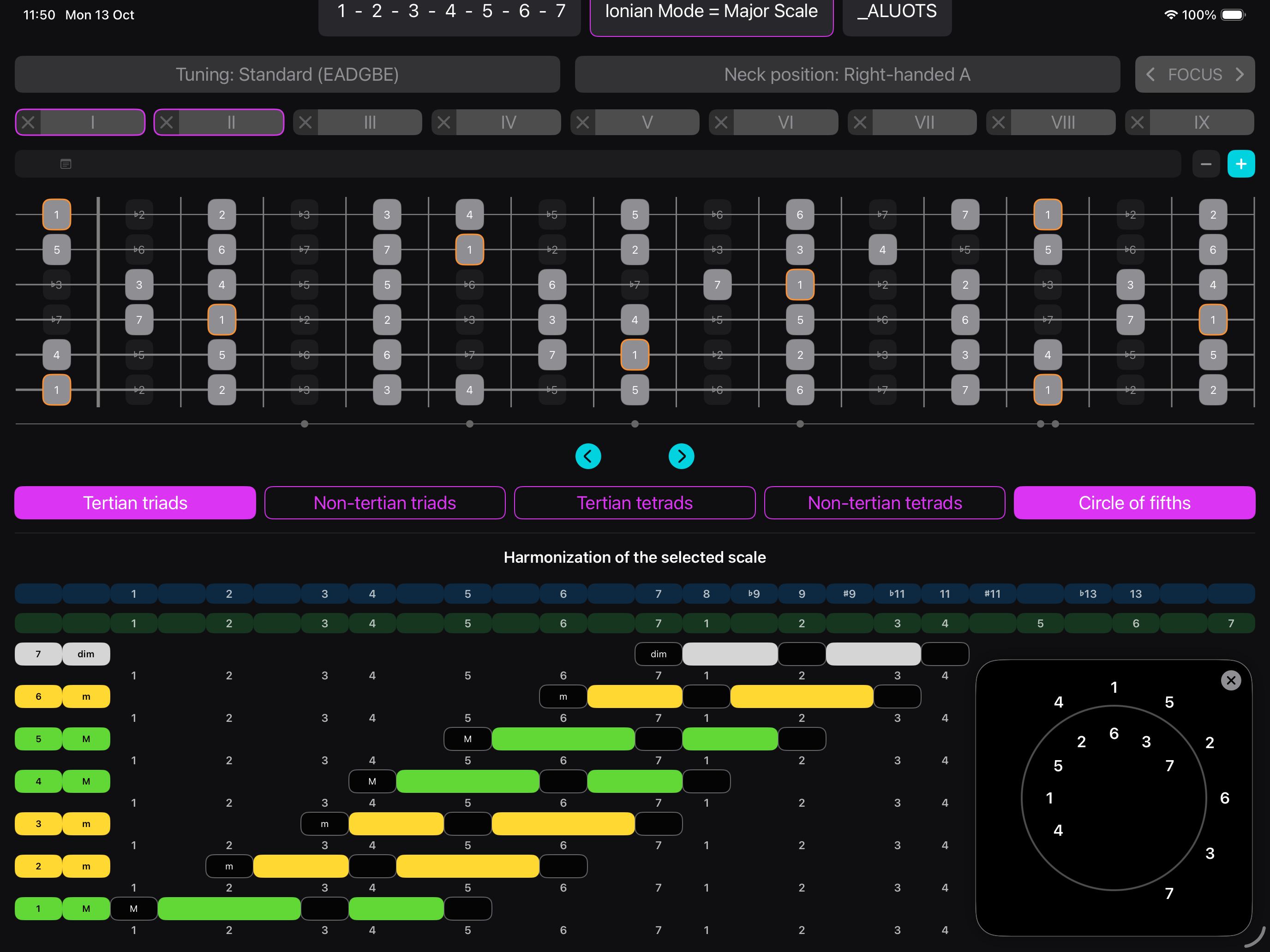 Thanks to the dedicated Circle of fifths for each scale, you can easily create smooth chord progressions.